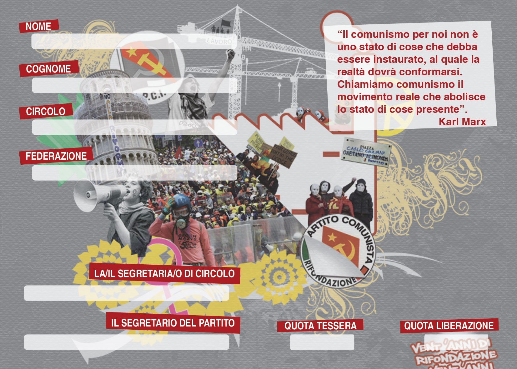 Il 21 Gennaio è una data importante per noi: ci facciamo gli auguri di un cammino ancora lungo e profiquo e, nel farceli, ricordiamo la grande storia dei comunisti in Italia. Il nostro pensiero va alla fondazione del Partito Comunista d’Italia. Per questo, da quelle radici antiche vogliamo ispirare la nostra Rifondazione Comunista, il nostro futuro. Avrebbe detto Togliatti: “Veniamo da lontano, andiamo lontano”. E’ così che inizia il TESSERAMENTO 2011 alle/ai Giovani Comuniste/i. Iscriviti… perché abbiamo bisogno di essere in tante e in tanti, perché di giovani e comunisti c’è urgenza più che mai! Compila il modulo nella colonna accanto e… BENVENUTA/O!